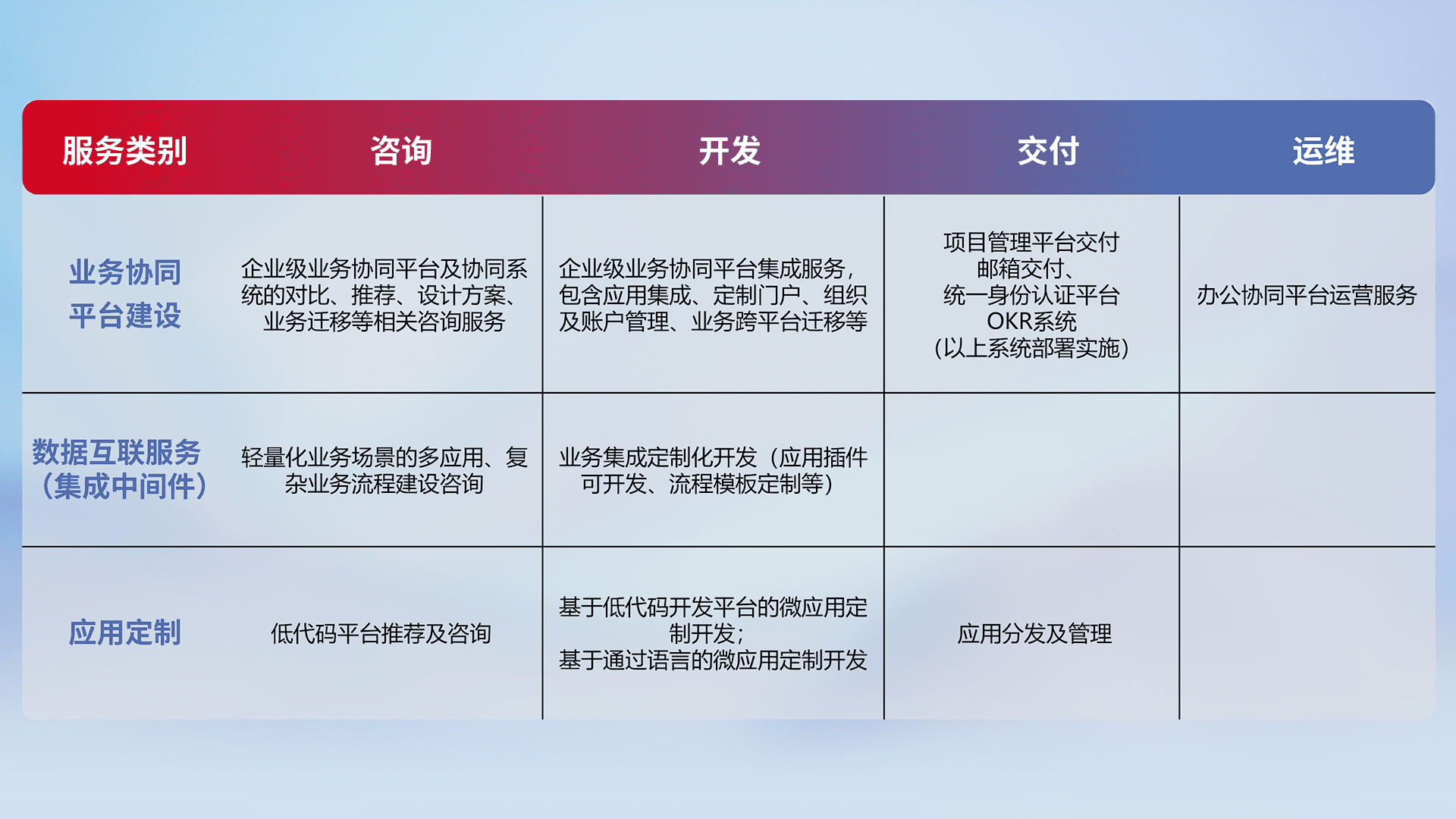 针对钉钉、、、、企微、、、IDaas等平台级产品提供产品的规划、、、、方案、、交付、、、、定制化开发等服务,,实现如统一协同办公、、、智能客户服务、、混合会议管理、、、智能数据查询、、等业务场景,,,实现数字化转型。。。